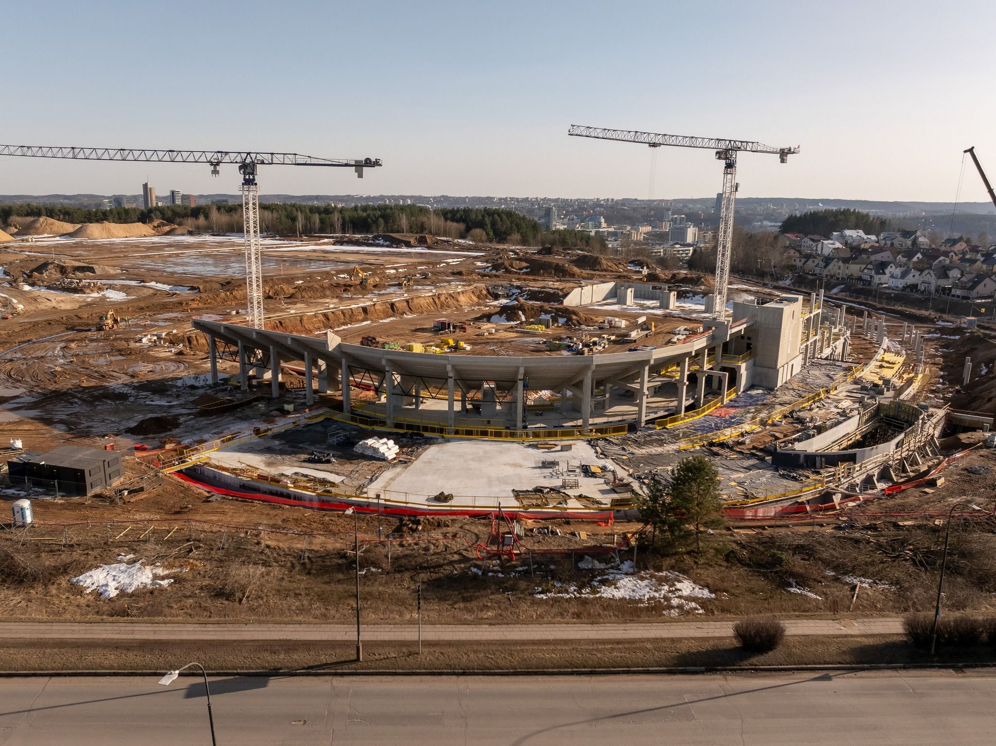 Statybvietėje darbai toliau vyksta intensyviai – montuojamos surenkamojo gelžbetonio konstrukcijos, sienos, kolonos, perdangos plokštės ir tribūnos. Prie darbų prisijungė ir antras kranas, todėl statybos vyksta dar efektyviau.
