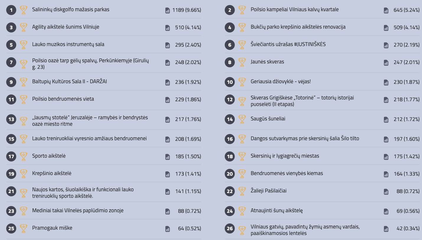 net 17 180 vilniečių balsavo ir rinko, kurios miesto idėjos turi tapti realybe kitais metais. Iš 244 idėjų buvo išrinktos 5 didelės ir 26 mažesnės apimities idėjos, kurios ateinančiais metais bus įgyvendintos savivaldybės lėšomis.